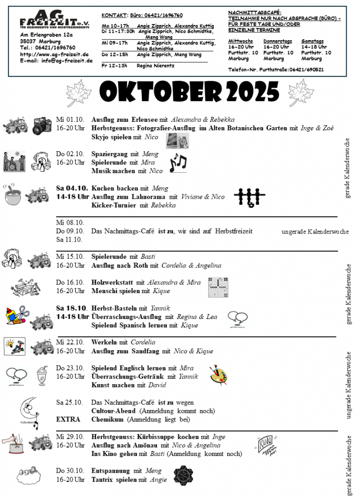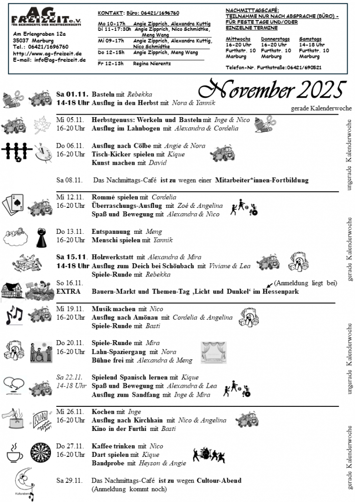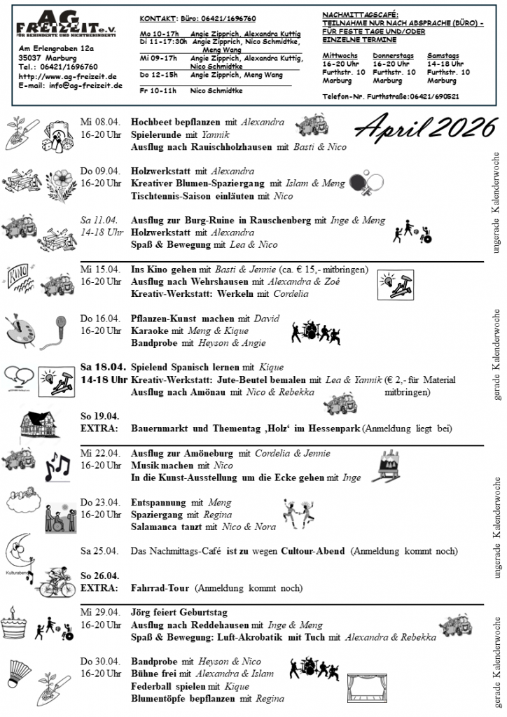 Im Nachmittagscafe können sich Jugendliche und Erwachsene mit (und ohne) Behinderung mit Freund*innen und Bekannten treffen, mit ihnen gemeinsam etwas unternehmen. wie z.B. in die Stadt gehen, ins Kino gehen, Ausflüge machen, malen, spielen, kickern, sich unterhalten, mit jemandem austauschen oder einfach kommen und mit dabei sein.